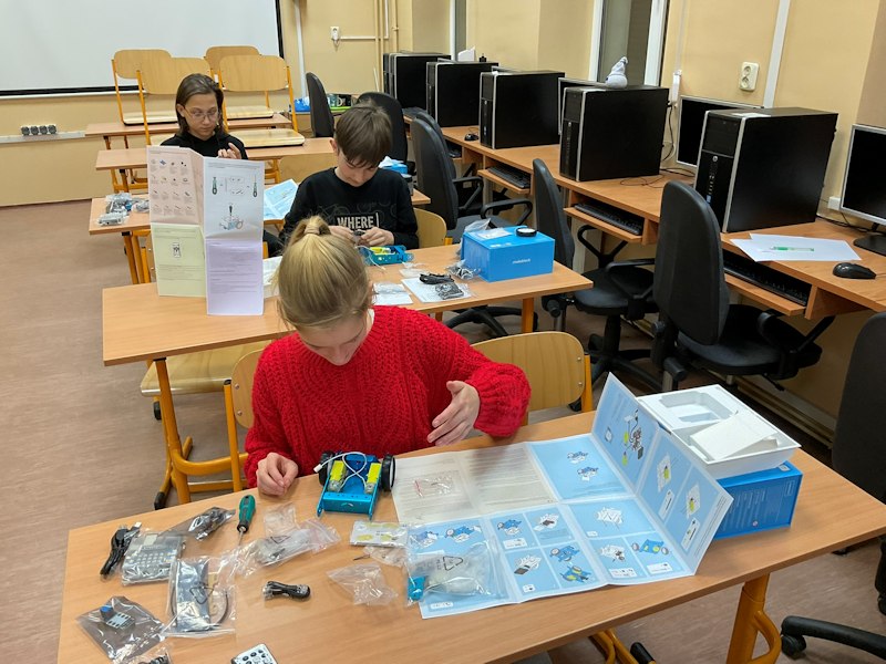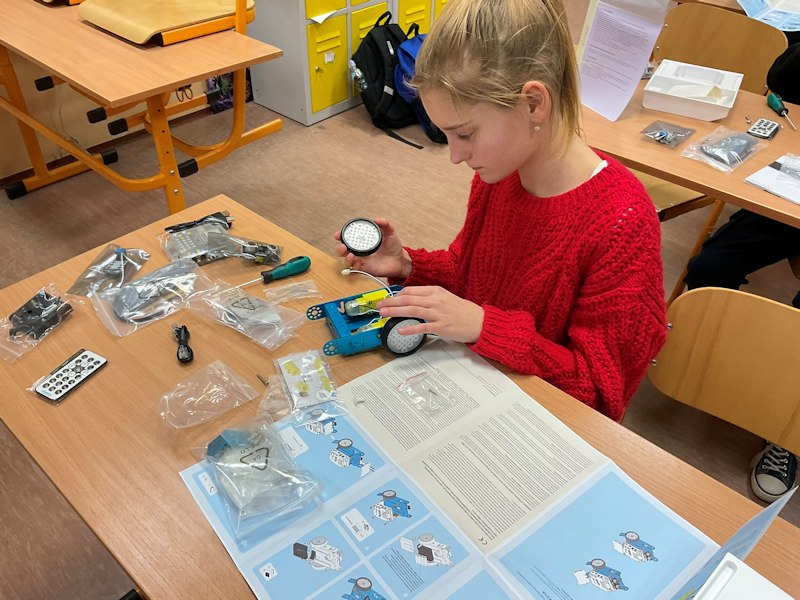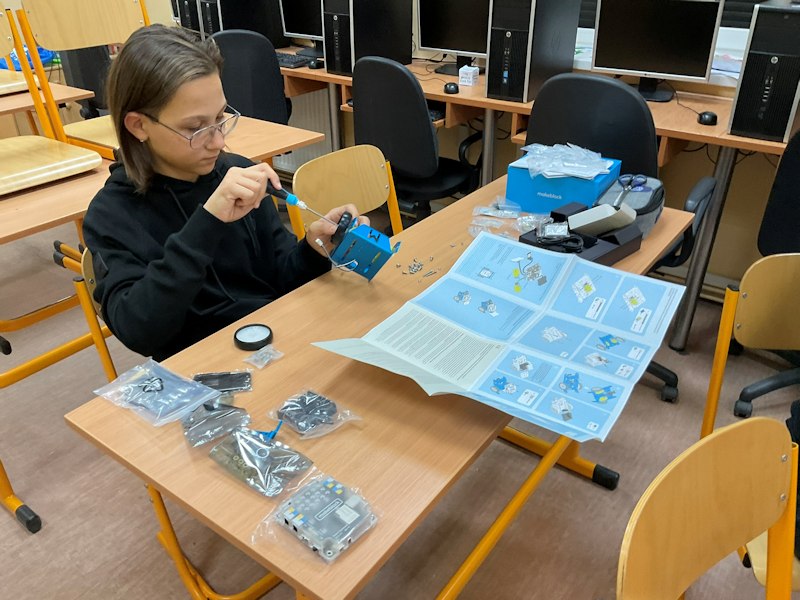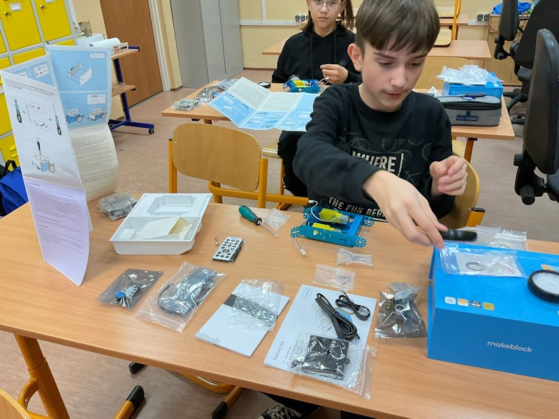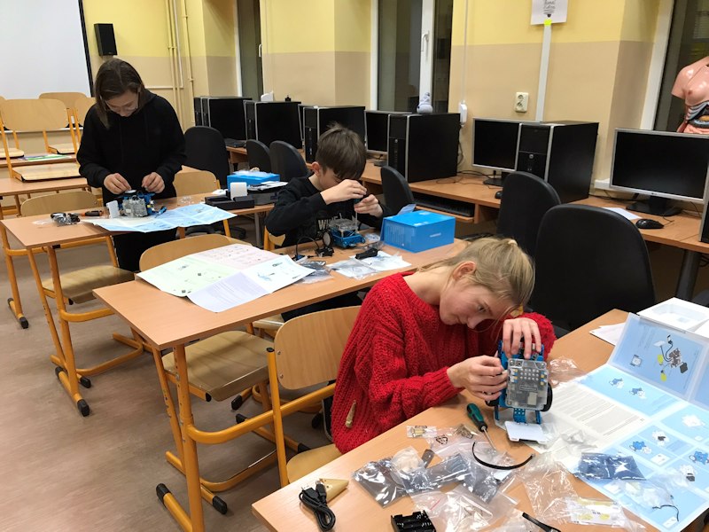 W listopadzie ruszyły też zajęcia dodatkowe z programowania i robotyki z wykorzystaniem sprzętu zakupionego w ramach Laboratoriów Przyszłości. Uczniowie rozpoczęli pracę od budowy robota z mikrokontrolerem Aduino oraz czujnikami lini, odległości, natężenia światła oraz w wyświetlaczem. W przyszłości będziemy go programować.
