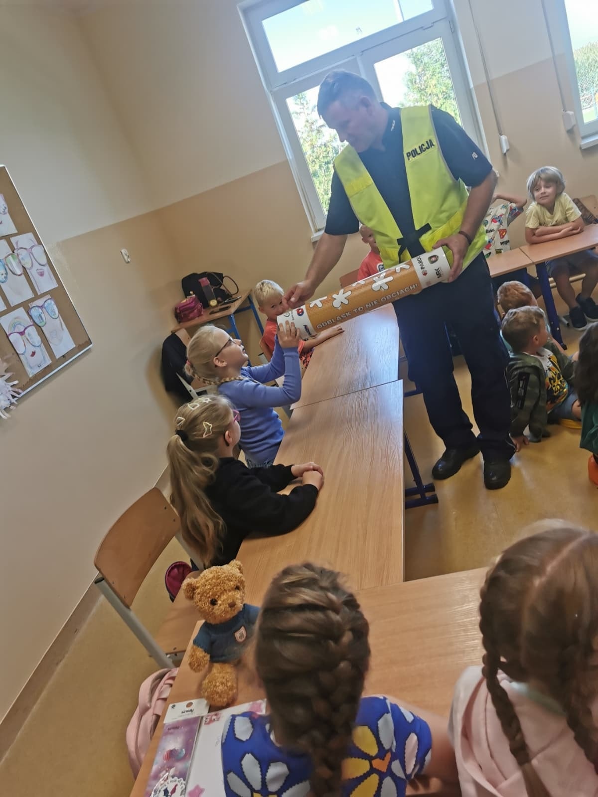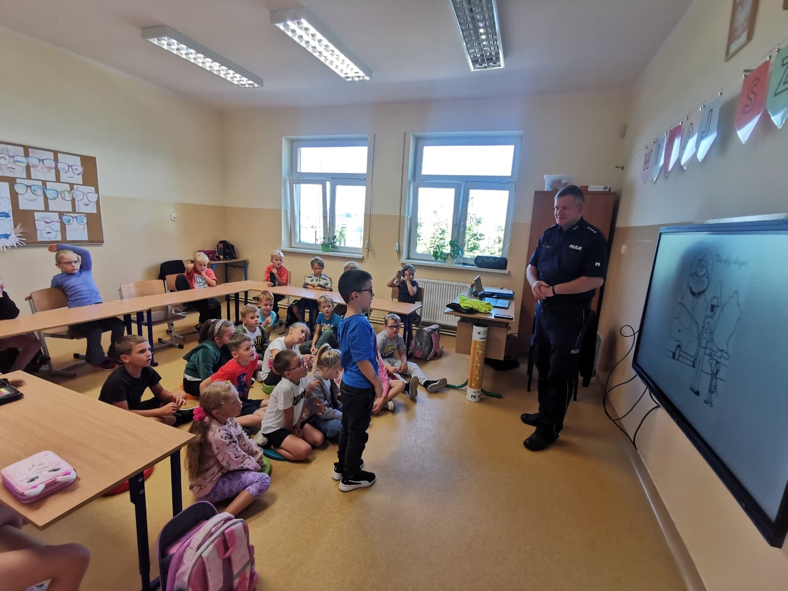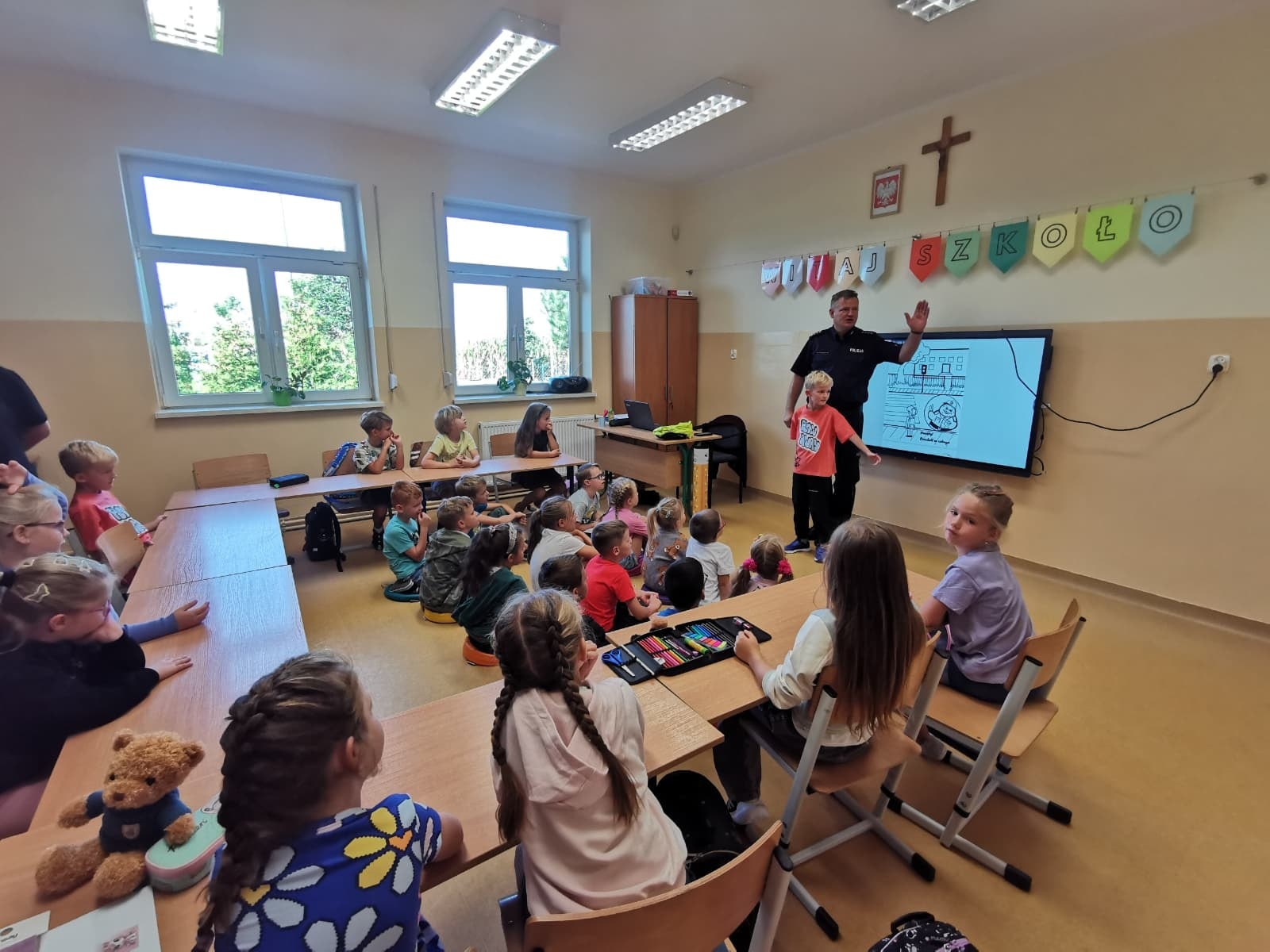 Spotkanie uczniów klas pierwszych z panem policjantem asp. szt. Krzysztofem Sochą. Dziękujemy za cenną lekcję na temat bezpieczeństwa na drodze