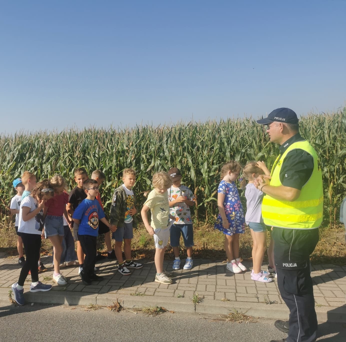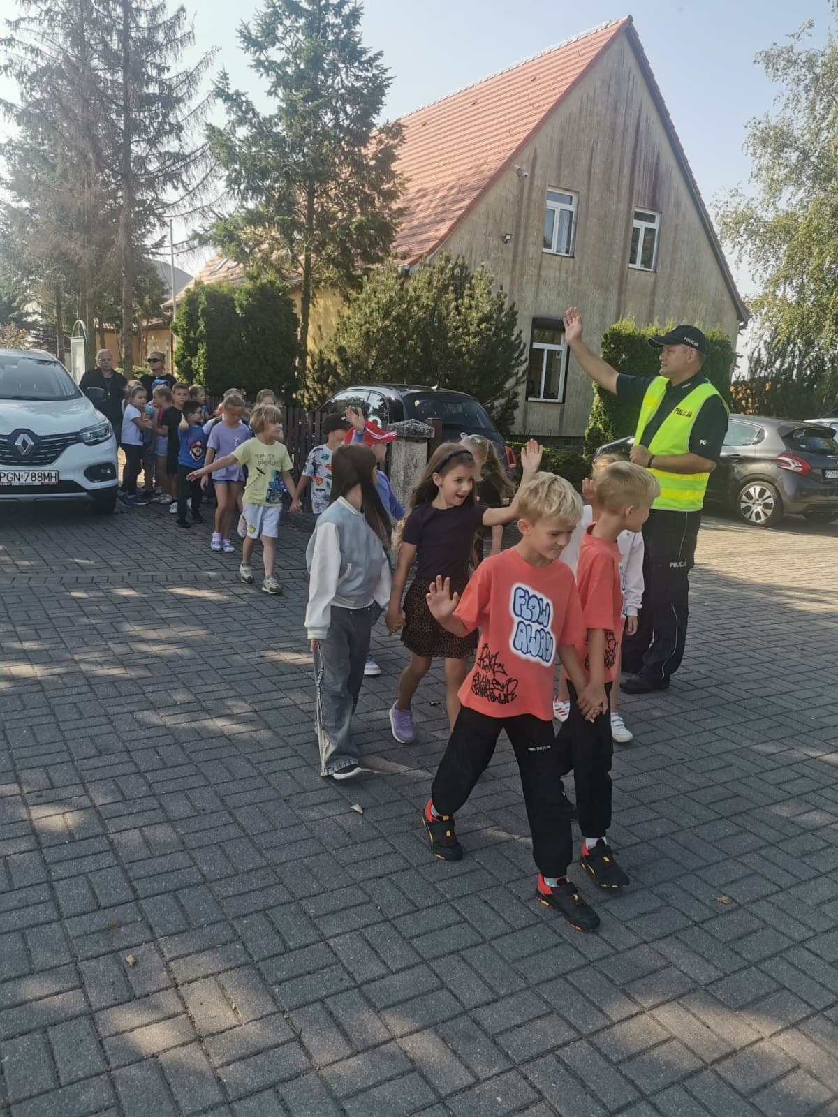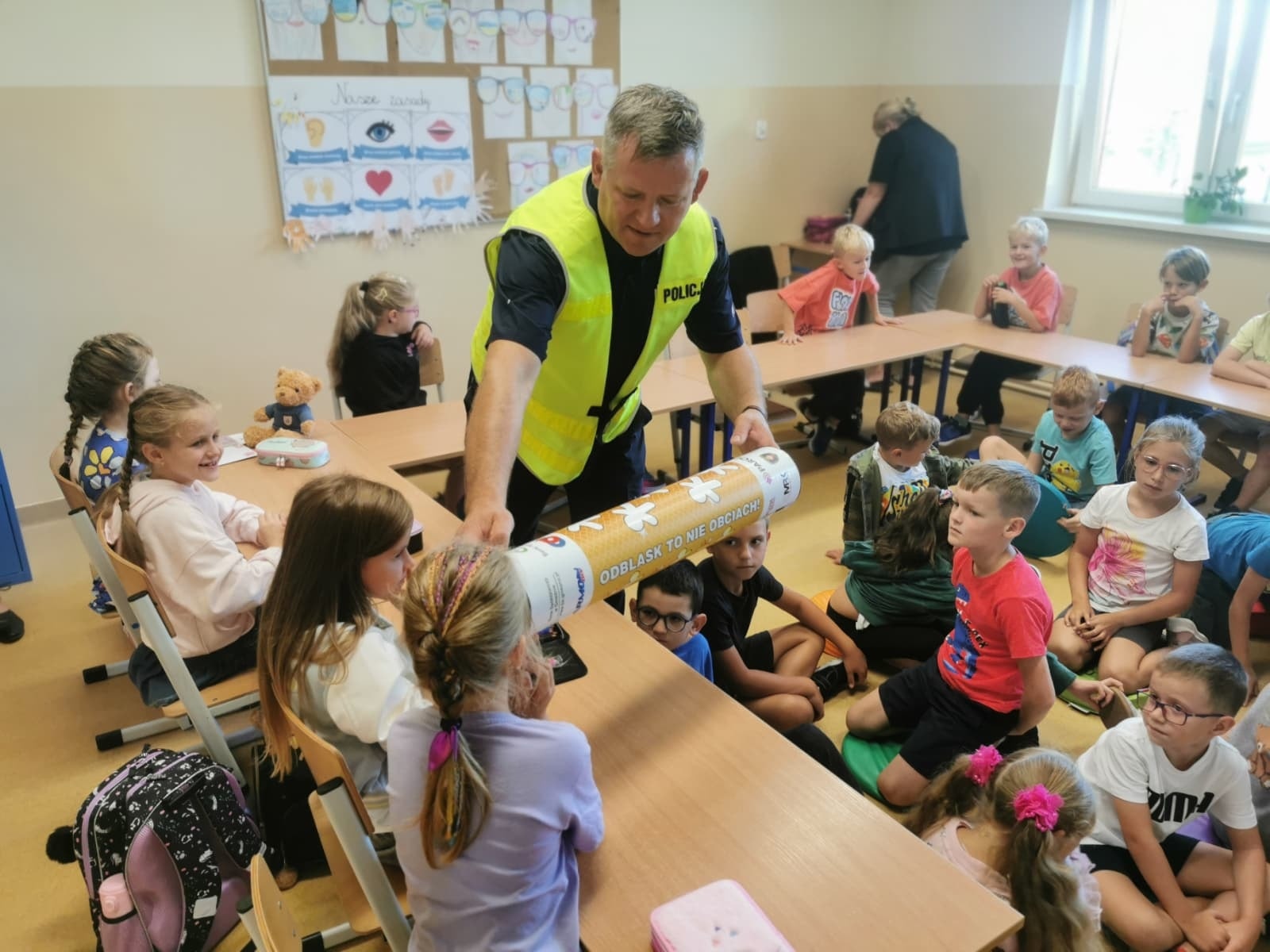 Spotkanie uczniów klas pierwszych z panem policjantem asp. szt. Krzysztofem Sochą. Dziękujemy za cenną lekcję na temat bezpieczeństwa na drodze