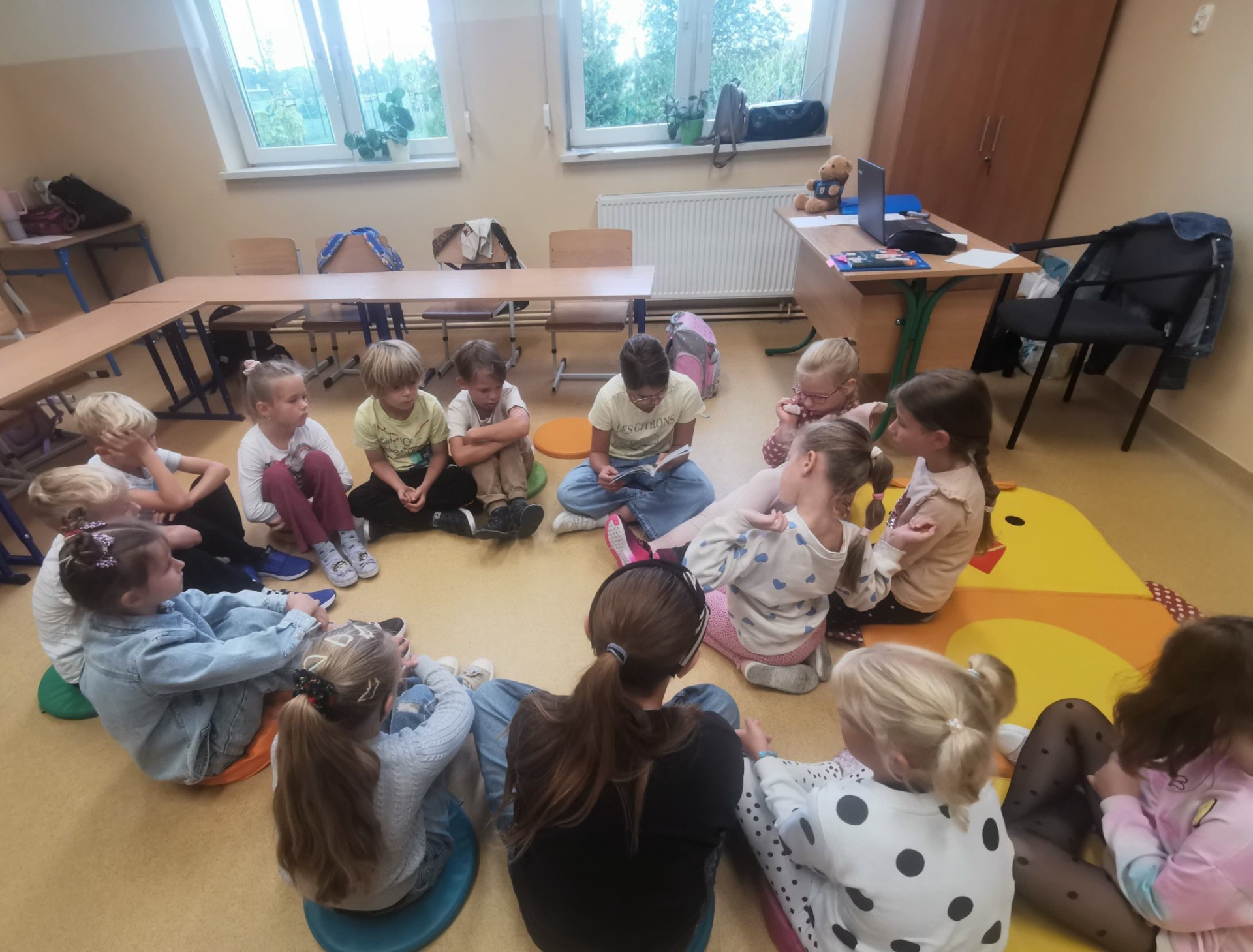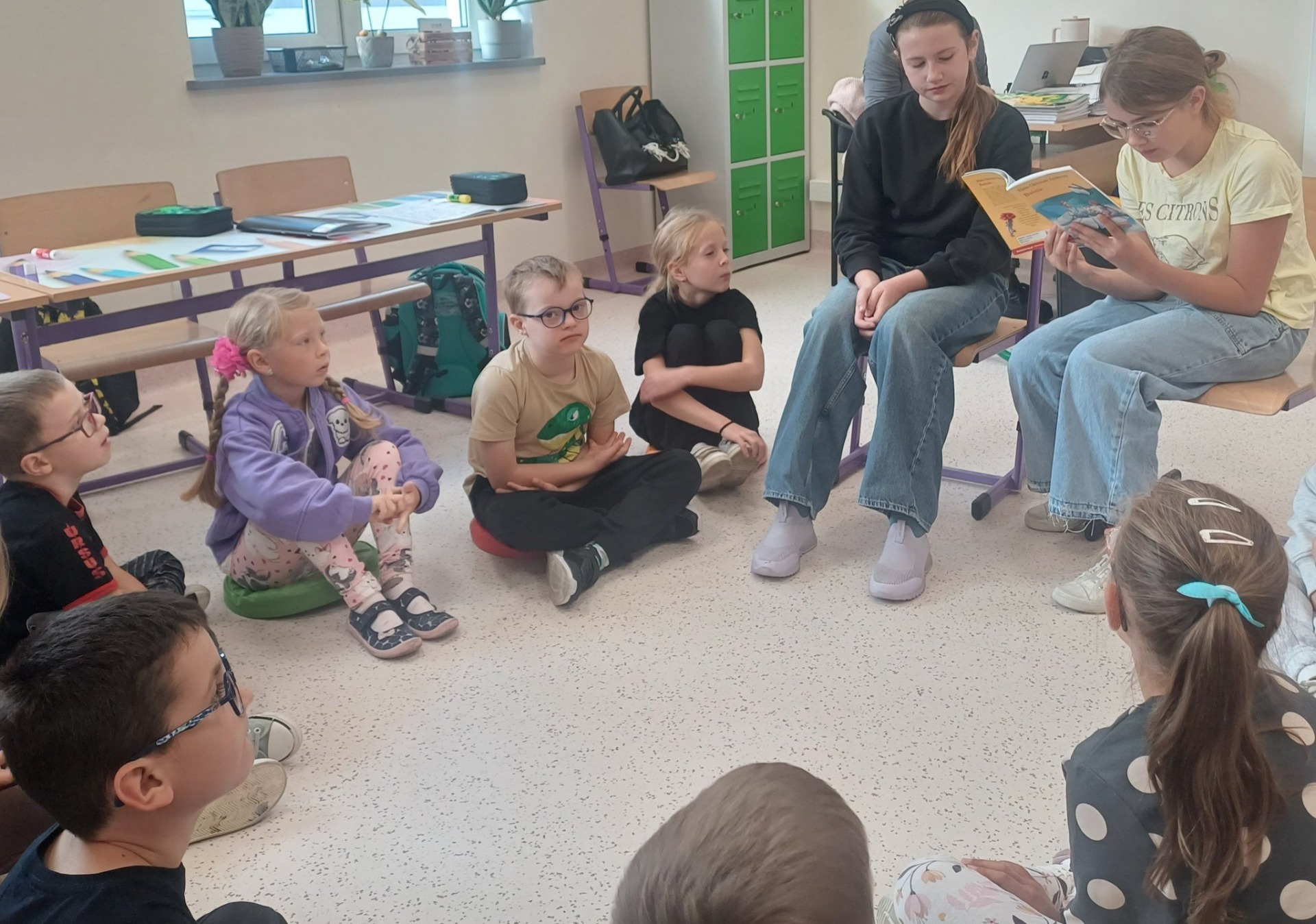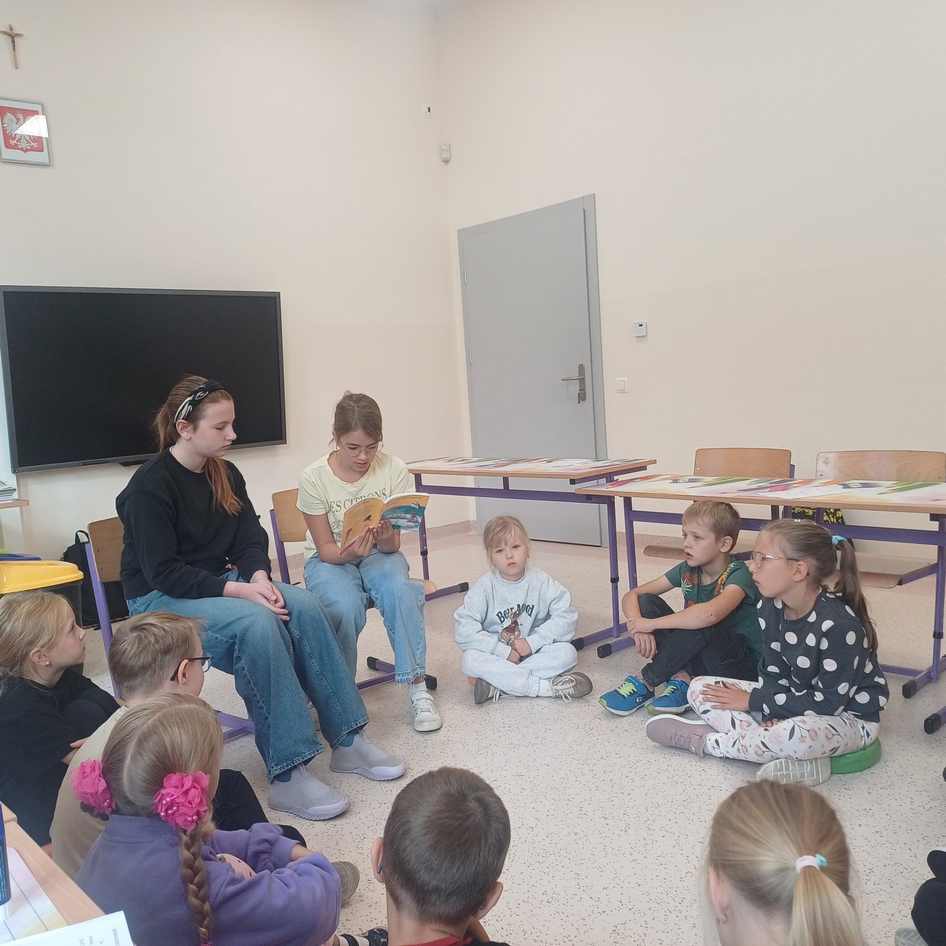 W naszej szkole młodzież z zaangażowaniem wspiera najmłodszych uczniów. Wolontariuszki Ania i Agata z klasy szóstej odwiedzają młodszych kolegów z klasy pierwsze i propagują czytelnictwo.